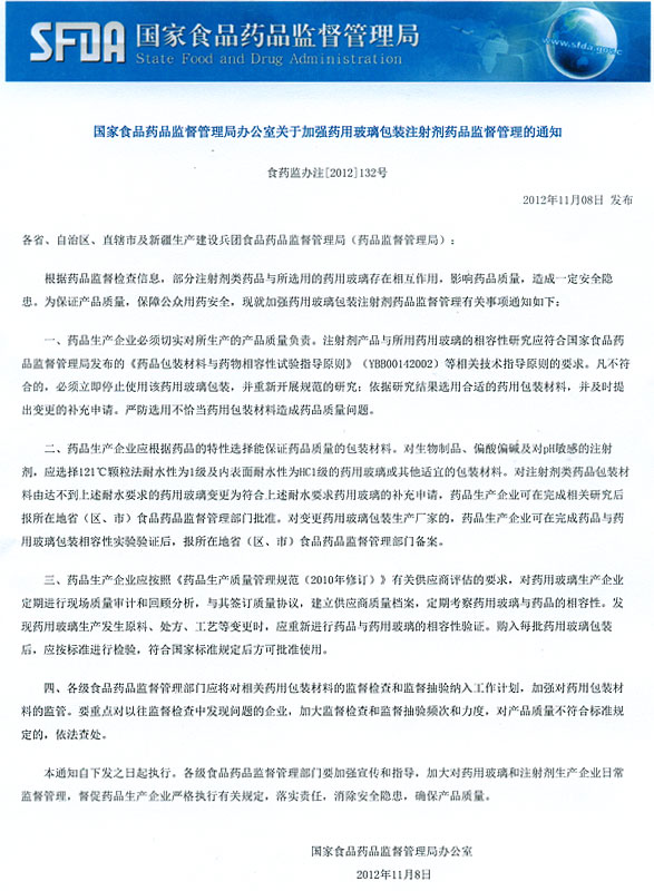 國家食品藥品監督管理局辦公室關于加強藥用玻璃包裝注射劑藥品監督管理的通知